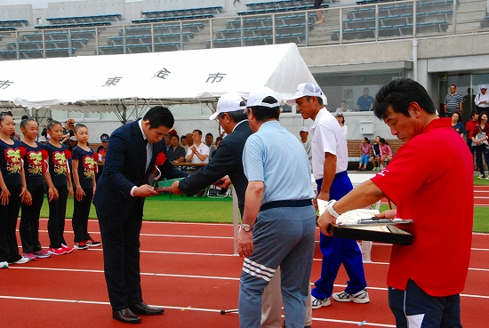 志賀市長より表彰を受ける比嘉男子主将 |