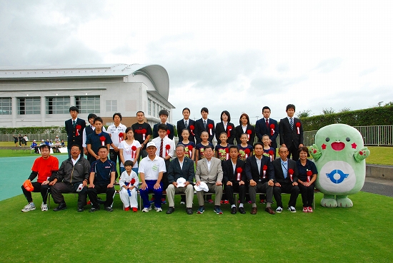 表彰者記念撮影(3列目右より、男子柔道部、女子柔道部、女子剣道部) |
