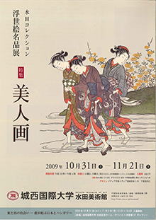 このたびの展覧会では、肉筆では師宣、宮川長春、勝川春章、葛飾北斎など、版画では錦絵以前の西村重長から、清長、歌麿、鳥文斎栄之、菊川英山、明治の月岡芳年まで、各時代を代表する絵師の作品によって、美人画の流れを概観します。なかでも、今回お披露目となる春信の《六玉川》は、水田家より新たに寄贈されたもので、鮮やかな色彩の残る稀少な名品です。これらの美人画を通して、豊かな江戸風俗と理想美の変遷をお楽しみください。