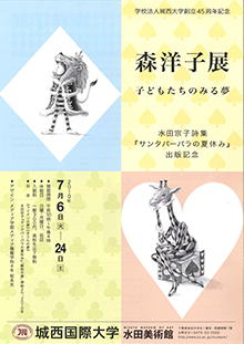 このたびの展覧会では、学校法人城西大学理事長・水田宗子の詩集『サンタバーバラの夏休み』の出版を記念し、10篇の詩とそれに寄せた挿絵の原画を紹介します。あわせて、童話をユーモラスに翻案した《路地裏の鬼》をはじめとした絵の連作と、段ボールと紙粘土で細部まで作りこんだミニチュアの図書館や映画館などの、ぬくもりあふれる《満月村》シリーズを展示します。
