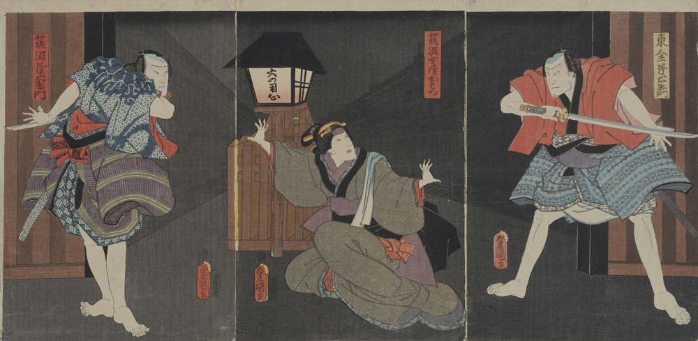 Nakamura Fukusuke I as Tōgane Moemon, Ichikawa Ichizō III as Tsukuba Moemon, and Ichikawa Shinsha I as Tsukuba's Wife Ohatsu