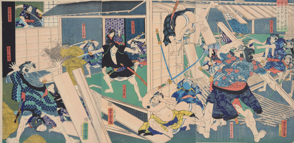 Kasagawa Higezō and Keiriki Tamigorō attack the House of the Mistress of Iioka Sutegorō at Night in a Secret Plan, in Modern Water Margin