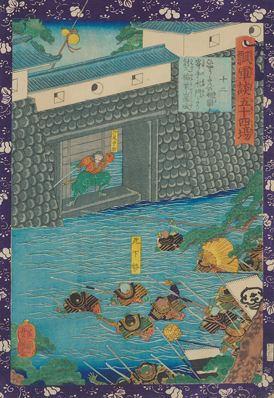 Fifty-four Scenes from the War Chronicle of Hideyoshi: No.12, When a Gourd Is Raised as a Signal, the Warriors Raid the Enemy’s Floodgate and Inabayama Castle Falls