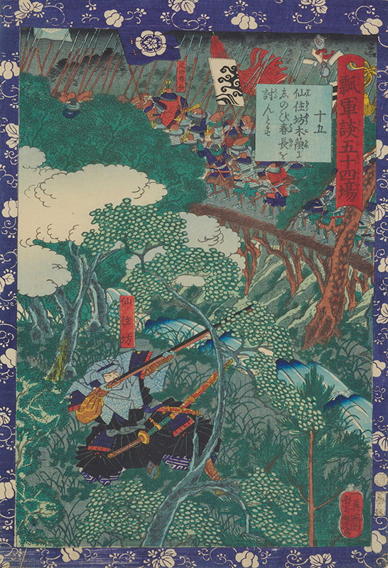 Fifty-four Scenes from the War Chronicle of Hideyoshi: No.15, Senjūbō Hides in the Shade of a Tree and Tries to Kill Harunaga