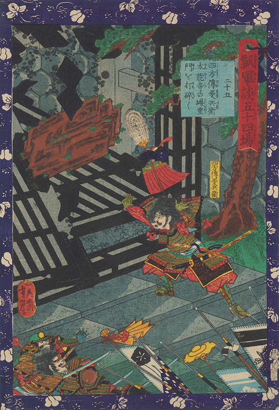 Fifty-four Scenes from the War Chronicle of Hideyoshi: No.25, Shihōden Masabē Smashes Heijimon Gate of the Honnō-ji Temple