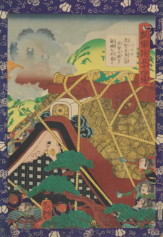 Fifty-four Scenes from the War Chronicle of Hideyoshi: No.27, Takechi Umanosuke Destroys the Enemy’s Castle with a Cannon