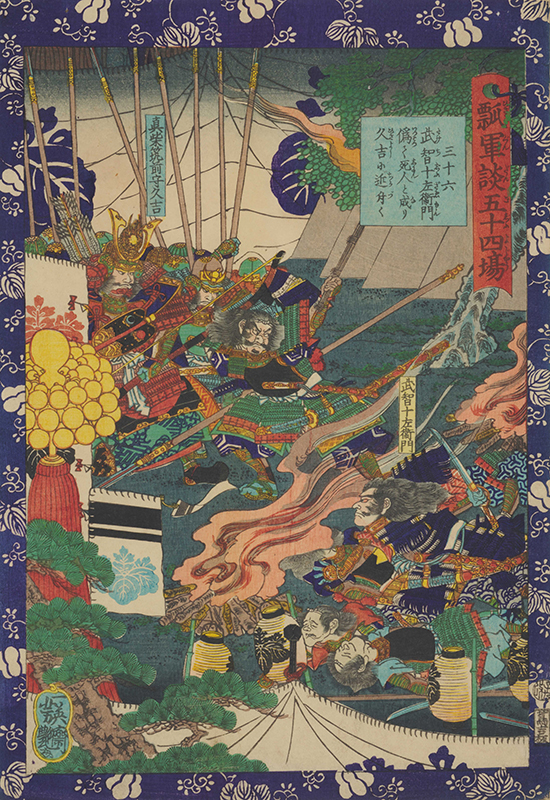 Fifty-four Scenes from the War Chronicle of Hideyoshi: No.36, Takechi Jūzaemon Approaches Hisayoshi as if He Were a Dead Man
