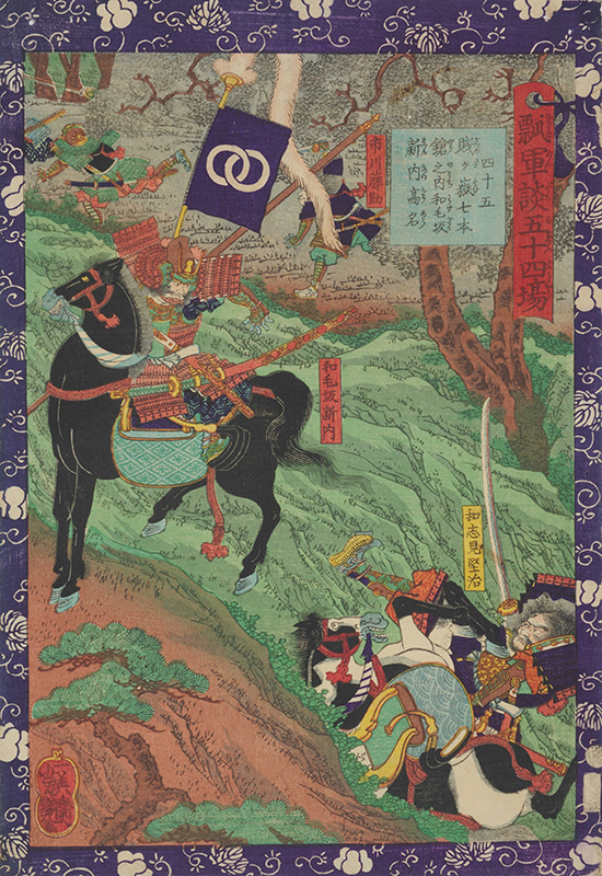 Fifty-four Scenes from the War Chronicle of Hideyoshi: No.45, Credit of Wakesaka Shinnai among the Seven Spears of Shizugatake