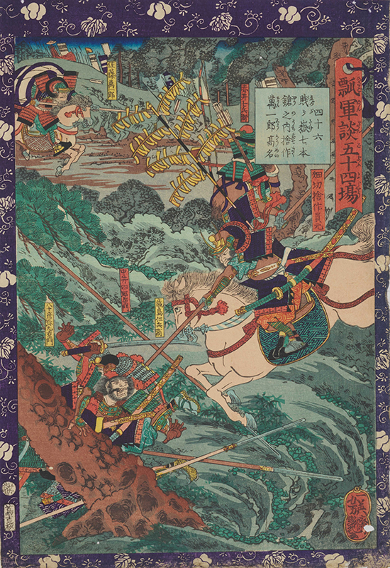 Fifty-four Scenes from the War Chronicle of Hideyoshi: No.46, Credit of Sutesaku and Man’ichirō among the Seven Spears of Shizugatake