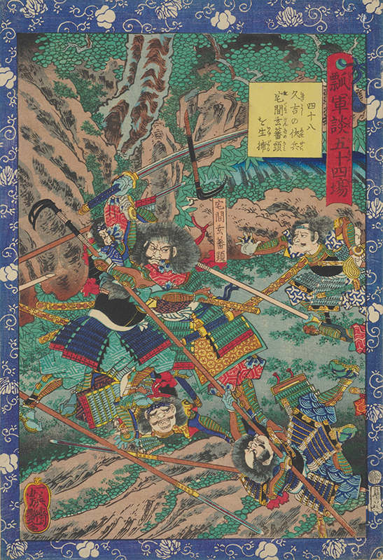 Fifty-four Scenes from the War Chronicle of Hideyoshi: No.48, Ambushes of Hisayoshi Catches Takuma Genbanokami Alive