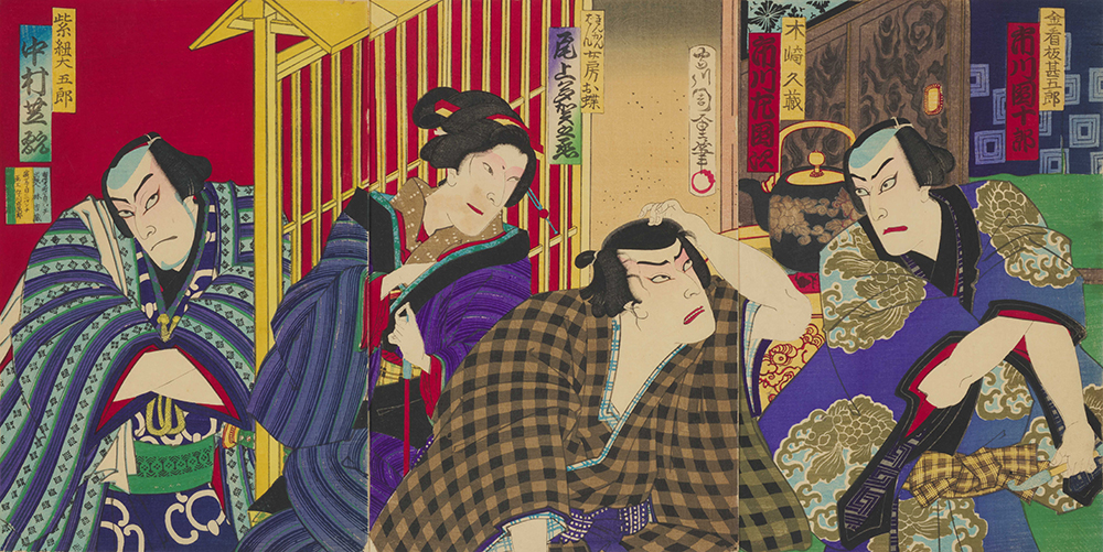 Ichikawa Danjūrō Ⅸ as Kinkanban Jingorō, Ichikawa Sadanji as Kizaki Kyūzō, Onoe Taganojō Ⅱ as Kinkanban's wife Ochō, and Nakamura Shikan Ⅳ as Murasakihimo Daigorō