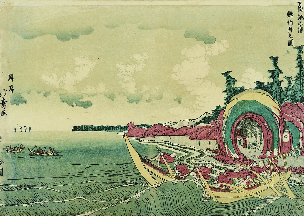 鰹の一本釣りが始まっている沖合に向けて、版元・西村屋の巴印の旗を掲げた釣船が波にあらがい漕ぎ出していく。銚子の東端から外川浦、遠くに屏風ヶ浦の海岸を望んだ景で、中央につきでた犬の形の岩は源義経伝説にまつわる犬若(犬岩)である。手前の奇岩は胎内くぐりと呼ばれる海食洞で、本来別の場所にある磯巡りの人気スポットが描き込まれている。水平線が低く、画面の半分以上を占める広々とした空と幾重にも湧き立つ雲は、「雲の画家」こと北寿の特徴的な表現。浮世絵にベロ藍が使われ始める前の作品で、海と空に、退色しやすい露草の青が残る貴重な作品である。