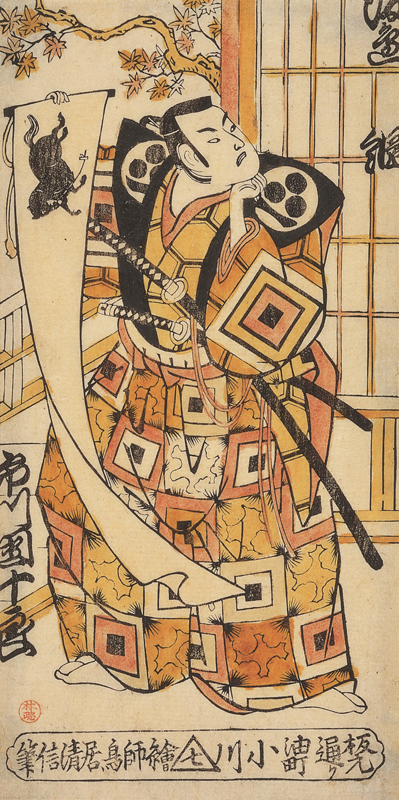 右手に旗を持ち、見得を切る立役が描かれる。享保19年11月の市村座顔見世「陸ノ奥勢源氏(みちのくゆんぜいげんじ)」に取材したと推測される作品。『前太平記』を題材とした狂言で、渡辺綱は、源頼光(みなもとのらいこう)の四天王の一人として活躍し、大江山の酒呑童子退治や、鬼の腕を切り落とした逸話など、数々の武勇伝で知られる。肩衣の紋は渡辺星。本作品のように、墨摺に、紅などのほか、水膠(にかわ)や姫糊を混ぜた艶墨で筆彩し、その光沢を楽しむ作品を漆絵(うるしえ)という。