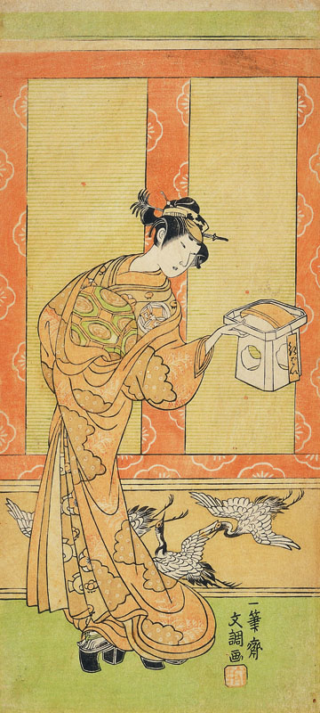 御簾(みす)の前で三方を捧げ持つ女形が、細身ながらふっくらと丸みのある輪郭線で描かれる。三方には「紅ばい」と書かれた短冊を添えた紙包みのようなものが載せられている。立兵庫髷、髪飾り、前帯と打掛の様子、高下駄といった風俗より遊女の役と思われるが、取材狂言は不明。着物に描かれた定紋と似顔より、明和7年(1770)から安永元年(1772)に江戸の舞台にたった上方の女形、山下八百蔵と推測される。