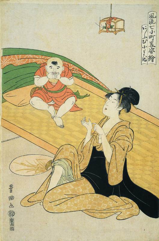 初秋の夜、子を寝かしつける前のひと時、親子で虫の音を聞きながら鸚鵡返しの言葉遊びをしている。七小町とは、小野小町にまつわる七つの説話で、「清水」「鸚鵡・逢夢(おうむ・あうむ)」「草紙洗」「卒塔婆(そとば)」「関寺」「通(かよい)」「雨乞」からなる。本作品はそれを今様風俗の見立絵とした揃物。鸚鵡小町は、年老いた小町が帝から贈られた歌を一字だけ変えて返歌をし、その才をみせたという話。