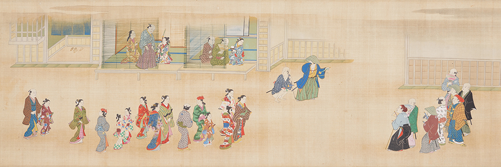 上巻に芝居茶屋から芝居小屋の内外といった歌舞伎風俗、下巻に隅田川の船遊びや吉原での遊楽の様子を色鮮やかに描いた名品。上巻は桜が咲く春、下巻は柳が茂る夏から楓が色づく秋の光景である。ジェノヴァ東洋美術館蔵の画巻など、ほぼ同じ図様の作品が散見し、長春が同趣向の画巻を複数制作していたことが知られる。