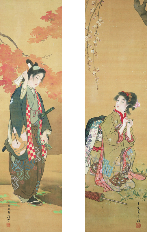 蕉園が右幅にしだれ桜の下にしゃがみ、振り返って仰ぎ見る娘、輝方が左幅に赤く染まる紅葉の下で佇む若衆髷の青年を描いた「春秋」の双幅。娘の草花を手でもむしぐさや、若衆の手の表情からは、恥じらいつつも期待にふくらむ若い恋人たちの心情が伝わってくる。