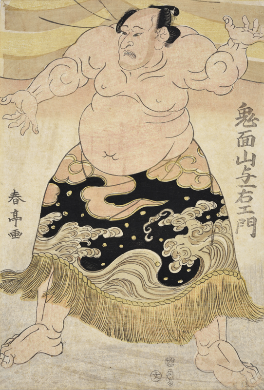 大関に昇進した後の鬼面山与一右エ門の化粧まわし姿で、容貌の特徴をとらえた似顔表現となっている。鬼面山は明和4年(1767)、下総国印旛郡(現富里市)生まれ。初代勝ノ浦甚五郎に入門し、寛政7年(1795)11月に入幕、文化10年(1813)正月に46歳で大関に昇進するが11月には関脇に陥落して引退、年寄・勝ノ浦与一右衛門となる。鬼面山は身長185㎝、体重158㎏の巨漢であったが、名大関・雷電為右衛門にはまったく勝てなかった。青葱堂冬圃の随筆『真佐喜のかつら』によると、鬼面山は腹が大きく前へ屈むことができず、煙管に火を付ける際は片手で火鉢を持ち上げていたが、火鉢を重くするいたずらをされても気付かずに持ち上げていたといい、鬼面山の怪力ぶりを伝えている。