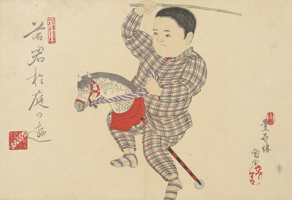 春駒(はるこま)に跨り、竹の刀を振り上げ雄姿を見せる男の子。春駒は張子などで作った馬の頭部に竹を差し、下端に車をつけた伝統的なおもちゃで、竹の胴に跨って遊ぶ。“若君”は、五分刈りの頭に、チェックの上下揃いの洋服に靴下という裕福な家庭の最先端のおでかけ着姿である。幼子の日常の情景を描いた揃物の1図で、ほかに「菜このみする子」「けいごに出る子」「魚市場の子」「夢中うなされるこども」「さかやきのきらゐなこ」などがある。
