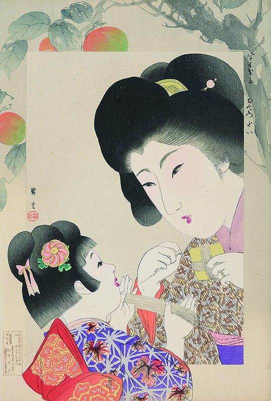 幼い娘が母の糸巻きの手伝いをしている。季節の風物として、周囲に描き表装のような趣向で赤く色づく柿の木が描かれている。「今すがた」は、四季折々の江戸情緒の残る風俗とともに、少女から大人の女性までをふっくらした頬とおちょぼ口の浮世絵風に描いた揃物で、54点が知られる。画面枠の外側に風景や草花を描くものと、余白だけのものがある。